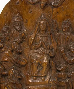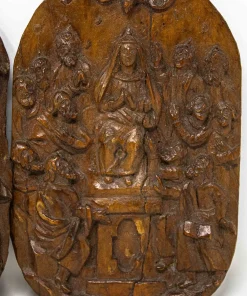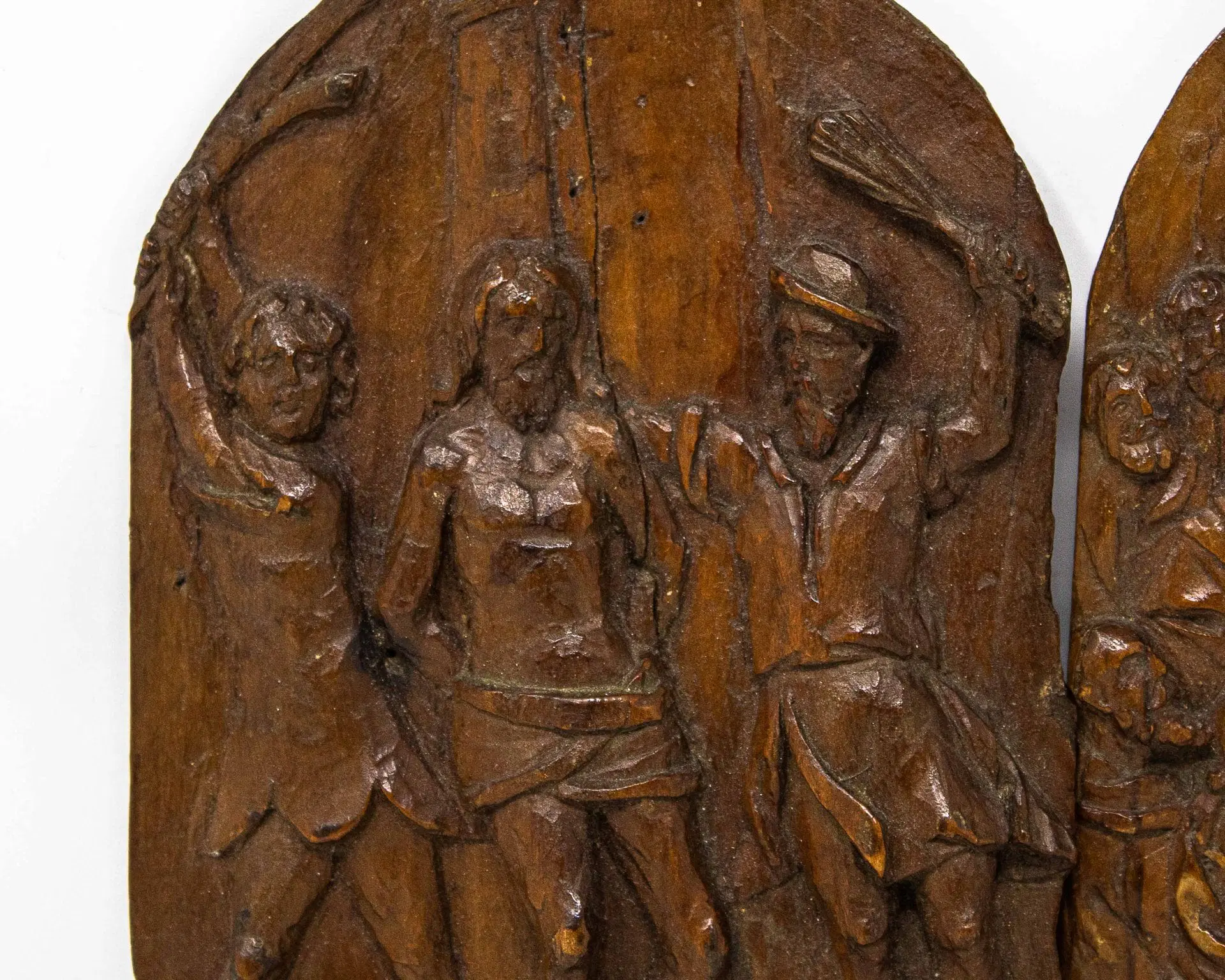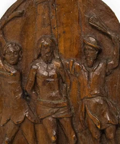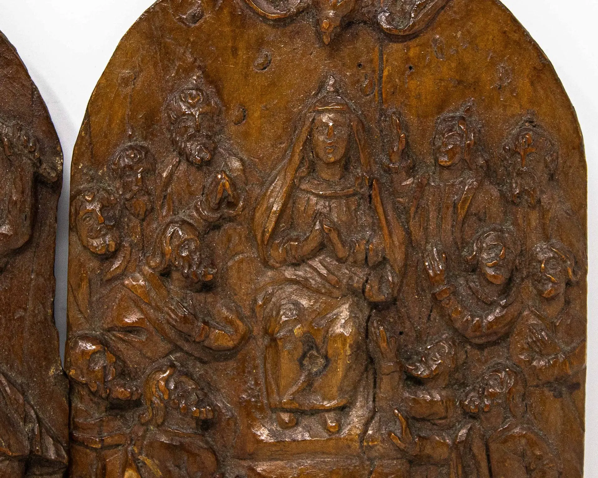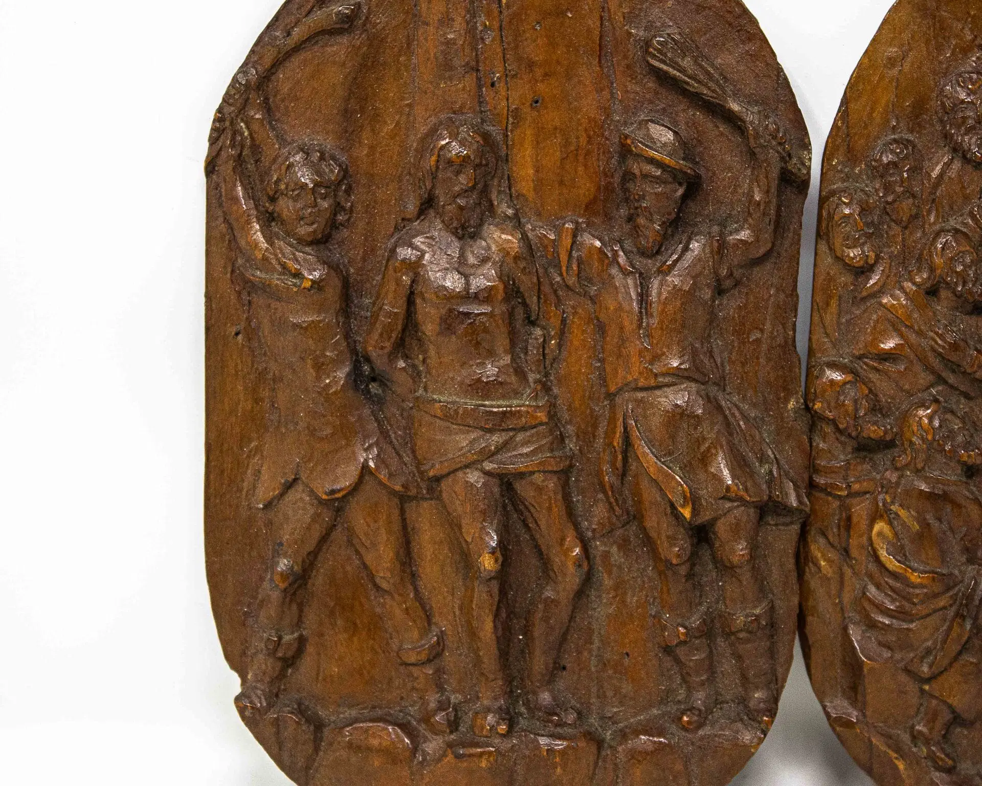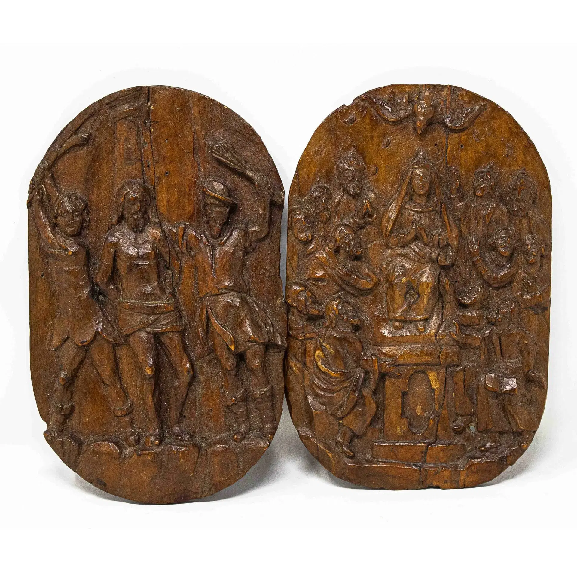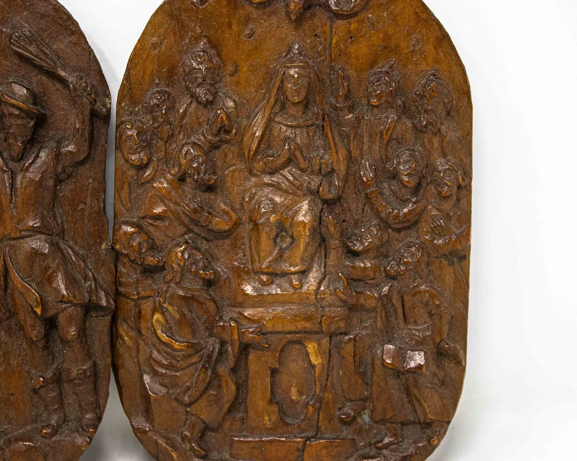 Le due opere, oggetto della presente esposizione, si presentano come due placchette di legno di pero, intagliato con grande maestria, raffiguranti scene religiose. La prima placchetta raffigura la Pentecoste, episodio narrato negli Atti degli Apostoli (2,1-11) secondo i quali un giorno lo Spirito Santo scese sotto forma di lingue di fuoco sugli Apostoli, tutti riuniti nel medesimo luogo, ognuno dei quali cominciò a parlare una lingua differente. Seppur da tale lettura si deduca che lo Spirito sia elargito attraverso Cristo risorto, nelle raffigurazioni dell’episodio egli non compare mai. Generalmente le lingue di fuoco vengono raffigurate sotto forma di fiammelle, come nel caso della nostra opera, poste sul capo degli apostoli e provenienti da una colomba in alto, nel centro della composizione, simbolo dello Spirito Santo. La presenza frequente della Madonna al centro della scena, in mezzo agli Apostoli, non rappresenta una ricostruzione letterale del racconto, nel quale non viene nominata, ma una supposizione teologica che si è diffusa tra gli artisti nel corso dei secoli, legando l’episodio della Pentecoste a quello precedente, nel quale si dice che gli Apostoli pregavano insieme ad altre donne, tra cui la Madonna. La Vergine in questo caso assume un valore simbolico, rappresentando la Chiesa, della quale gli Apostoli sono i messaggeri, analogamente all’Ascensione. Difatti, la Vergine, come si nota nella placchetta, è posta in posizione rialzata e centrale su un trono, con le mani giunte, coperta dal velo e con lo sguardo rivolto verso la colomba. In tal modo viene rimarcata la superiorità della donna rispetto ai dodici Apostoli, i quali sono colti in pose differenti ed agitate che rimandano al momento in cui ricevettero il dono dello Spirito e iniziarono a parlare tutti insieme lingue differenti. Scendendo più nel dettaglio, l’artista con grande maestria ha intagliato attentamente a basso rilievo le tuniche e i mantelli degli apostoli, posti trasversalmente sul busto, non tralasciando i volti barbati, le mani e persino un libro di preghiera posto sulle ginocchia dell’apostolo di destra. Inoltre, è stata compiuta anche la pavimentazione della stanza e la base del trono con rilievo centrale. La seconda placchetta presenta una scena cruciale della passione di Gesù Cristo, narrata nei Vangeli: la flagellazione, detta anche Cristo alla colonna. Secondo il racconto il figlio di Dio, dopo essere stato condannato alla crocifissione, venne prima spogliato della veste e lasciato con un perizoma bianco, poi legato ad una colonna di marmo e colpito violentemente con verghe da alcuni aguzzini. Osservando la placchetta, il Cristo, come solitamente avviene nell’iconografia della scena, viene raffigurato al centro, appoggiato ad una colonna classicheggiante, in posa monumentale per sottolinearne la bellezza statuaria, mentre i due sgherri ai lati, che sollevano le verghe con violenza, pronti per colpirlo, hanno fisionomie più rozze in modo tale da alludere alla loro brutalità e ferocia. Anche in questo caso l’artista rende a rilievo i corpi e i dettagli, in particolar modo i panneggi delle tuniche, intagliati con perizia, senza tralasciare la base aggettante raffigurante il terreno brullo, su cui saldamente poggiano i tre personaggi. La posa delle braccia, la doppia punta della barba e i capelli ricadenti sulle spalle del Cristo possono rimandare ad un modello centrale per tale iconografia: il Cristo alla colonna del Bramante (1480-1490), conservato nella Pinacoteca di Brera di Milano. Entrambe le placchette sono composte giocando su differenti livelli, dal più schiacciato, come la colonna, al più prominente come i corpi dei protagonisti, rendendo in tal modo la spazialità.
