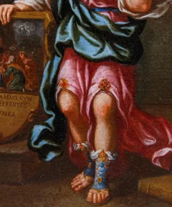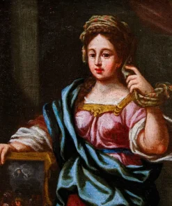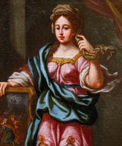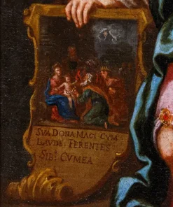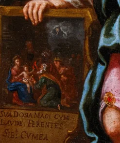 Nel nostro dipinto la sibilla è rappresentata stante: tra le mani regge uno stendardo che reca la raffigurazione dell’adorazione dei magi, evento cruciale per la storia dell’umanità che la sacerdotessa sta anticipando attraverso la profezia che descrive la scena e, al contempo, la prevede: “SUA DONA MAGI CUM LAUDE FERENTES”, ovvero i Magi portanti i loro doni con onore. Questa breve profezia, che si completerebbe con objicient puero myrham, aurum, thura sabae, ovvero mostreranno al bambino mirra, oro, incenso sabeo, è stata associata anche alla sibilla cimmeria nel corso dei secoli ma tendenzialmente nelle raffigurazioni artistiche si associava alla cumana, che perciò si accosta all’immagine dell’adorazione dei Magi. A ulteriore conferma del potere profetico della sibilla ritroviamo ai suoi piedi, sulla destra della composizione, uno dei mitici libri che raccoglievano le fondamentali previsioni relative agli sviluppi della storia di Roma e del Cristianesimo. Le vesti panneggiate e lo sguardo sereno ma, al contempo, estremamente deciso rivolto all’osservatore contribuiscono a fornire un’impressione di assoluta autorevolezza a questo personaggio mistico e intrigante.