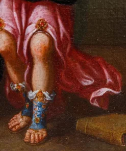 Il dipinto in questione ritrae una figura femminile seduta, identificabile come la Sibilla Eritrea grazie all’iscrizione “SIB ERITREA” visibile sulla base lignea su cui si innesta una cornice lignea entro cui è appunto raffigurata l’Annunciazione. La Sibilla è rappresentata con un’espressione pensierosa e serena. Indossa una veste con maniche ampie di colore rosa salmone, drappeggiata con un tessuto azzurro sulle spalle. Una spilla dorata con una pietra centrale decora il suo petto. La parte inferiore del suo abito è di un verde scuro vellutato, e le sue gambe sono coperte da una stoffa più chiara, forse bianca o avorio, che si increspa delicatamente. Ai piedi indossa dei sandali rossastri che si allacciano intorno alle caviglie. La sua testa è adornata da una corona di fiori blu e foglie verdi, e i suoi capelli castani sono raccolti in parte dietro la nuca. Il suo sguardo è rivolto leggermente verso destra, conferendo un senso di contemplazione. Nella sezione superiore dei grandi rotoli di pergamena su impalcatura lignea sono presenti tre cartigli che recano le scritte “HUMANITATI”, “IUNGETUR” e “DIVINITAS”, termini che se letti insieme si tradurrebbero con la divinità si unisce all’umanità. Nella tradizione cristiana, infatti, alla sibilla eritrea è attribuita una profezia sulla nascita del Redentore e, più in generale, la Redenzione dell’umanità; concordemente con la profezia nell’ edicola è rappresentato un’Annunciazione con la discesa dello Spirito Santo e del Bambino presso la Vergine che sta ricevendo l’annuncio dall’arcangelo Gabriele. In ultimo, se si considera la parola “DIVINITAS”, essa può essere anche interpretata come divinazione o dono della profezia, dando così una sfumatura di significato vicino al ruolo dell’effigiata.