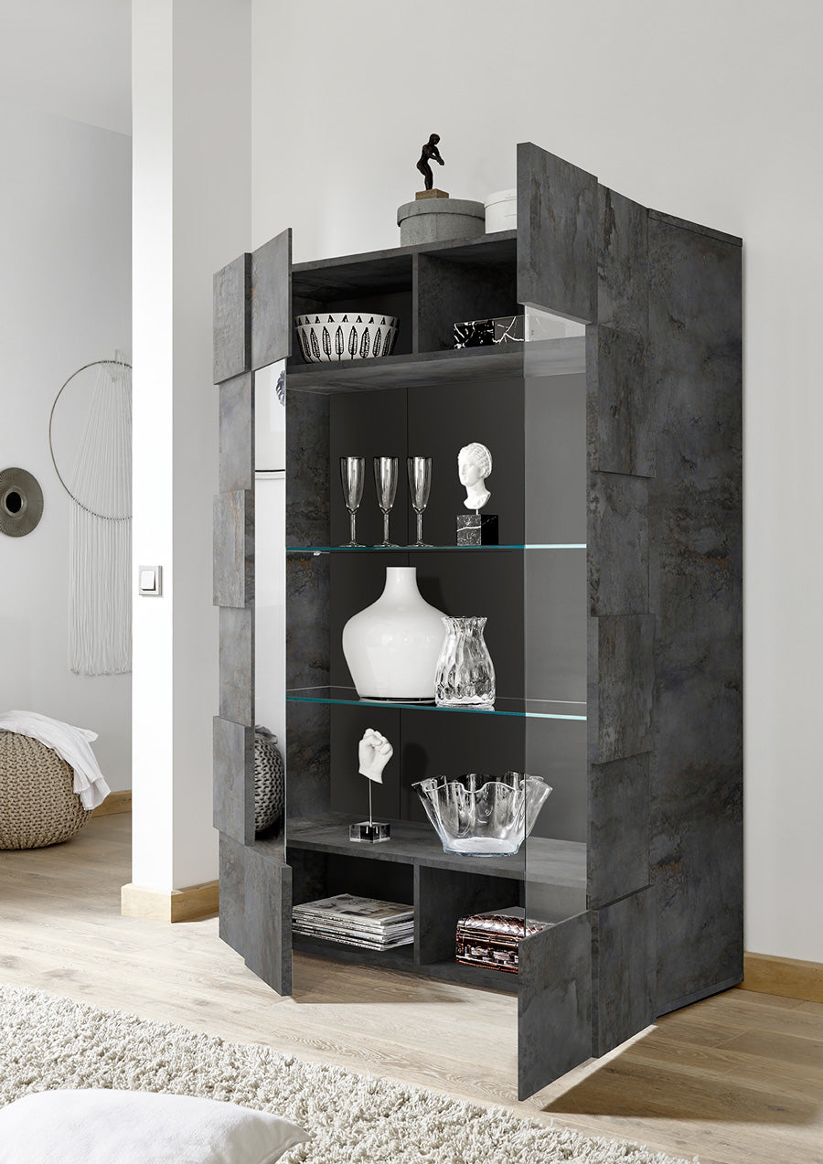 Vetrina moderna due ante Zina, ottima per una zona giorno moderna, pratica, destinata a chi vuole distinguersi. La vetrina è prodotta in melaminico con finitura ossido e stupendo design caratterizzato dal frontale con quadri ad effetto scacchiera.