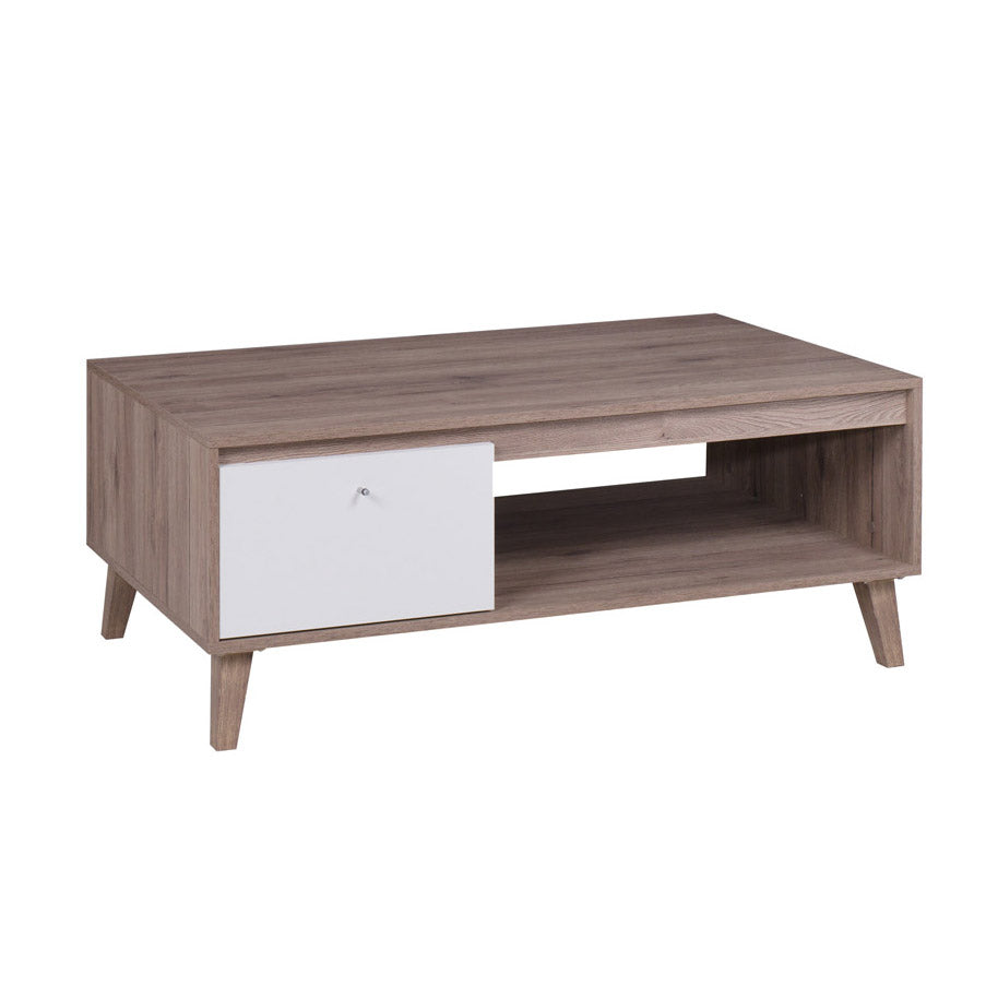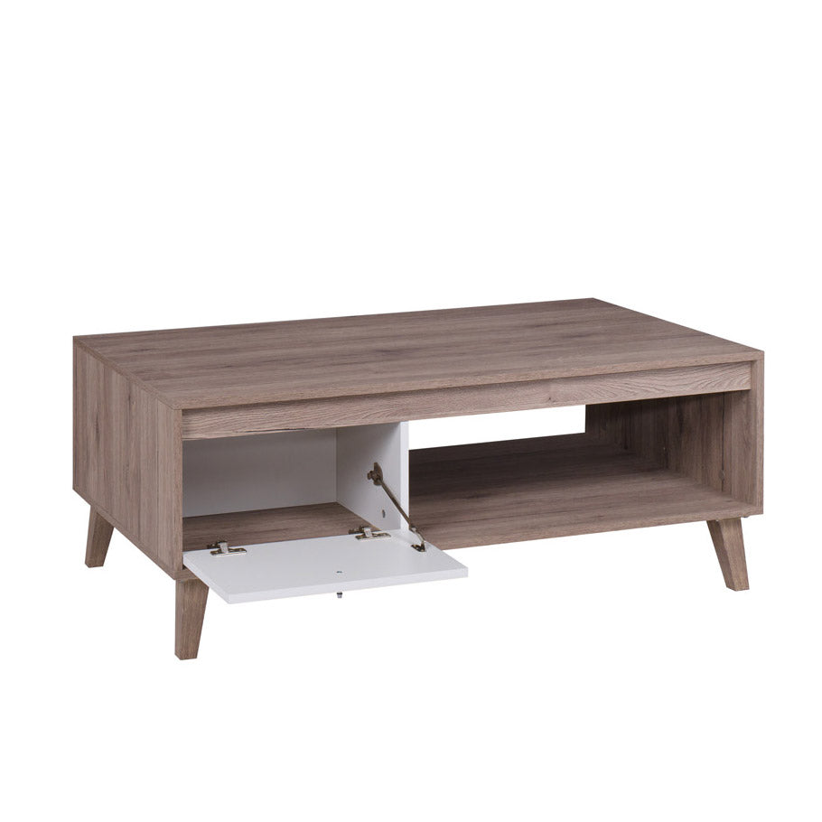 Tavolino da salotto in legno Zoraf definito da uno stile essenziale con una struttura ampia e funzionale. Infatti, il tavolino da caffè presenta dimensioni cm 120×65 e comprende un vano a giorno e un vano chiuso da un’anta a ribalta. Progettato come elemento versatile, lo stile sobrio del tavolino moderno Zoraf è la caratteristica più apprezzata, con colori tradizionali come bianco opaco abbinato alla una finitura naturale più chiara come oak o più scura come oak dark.