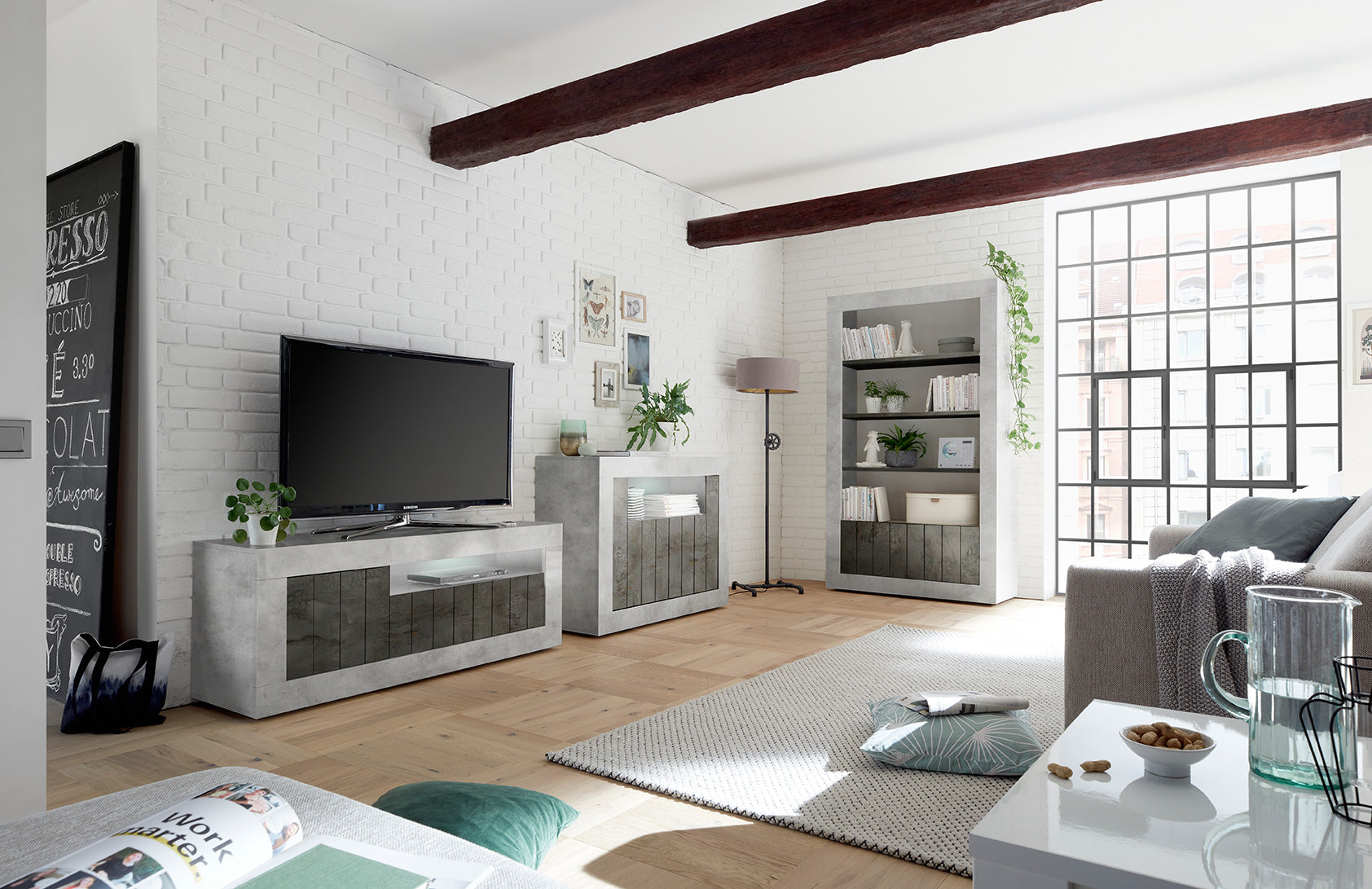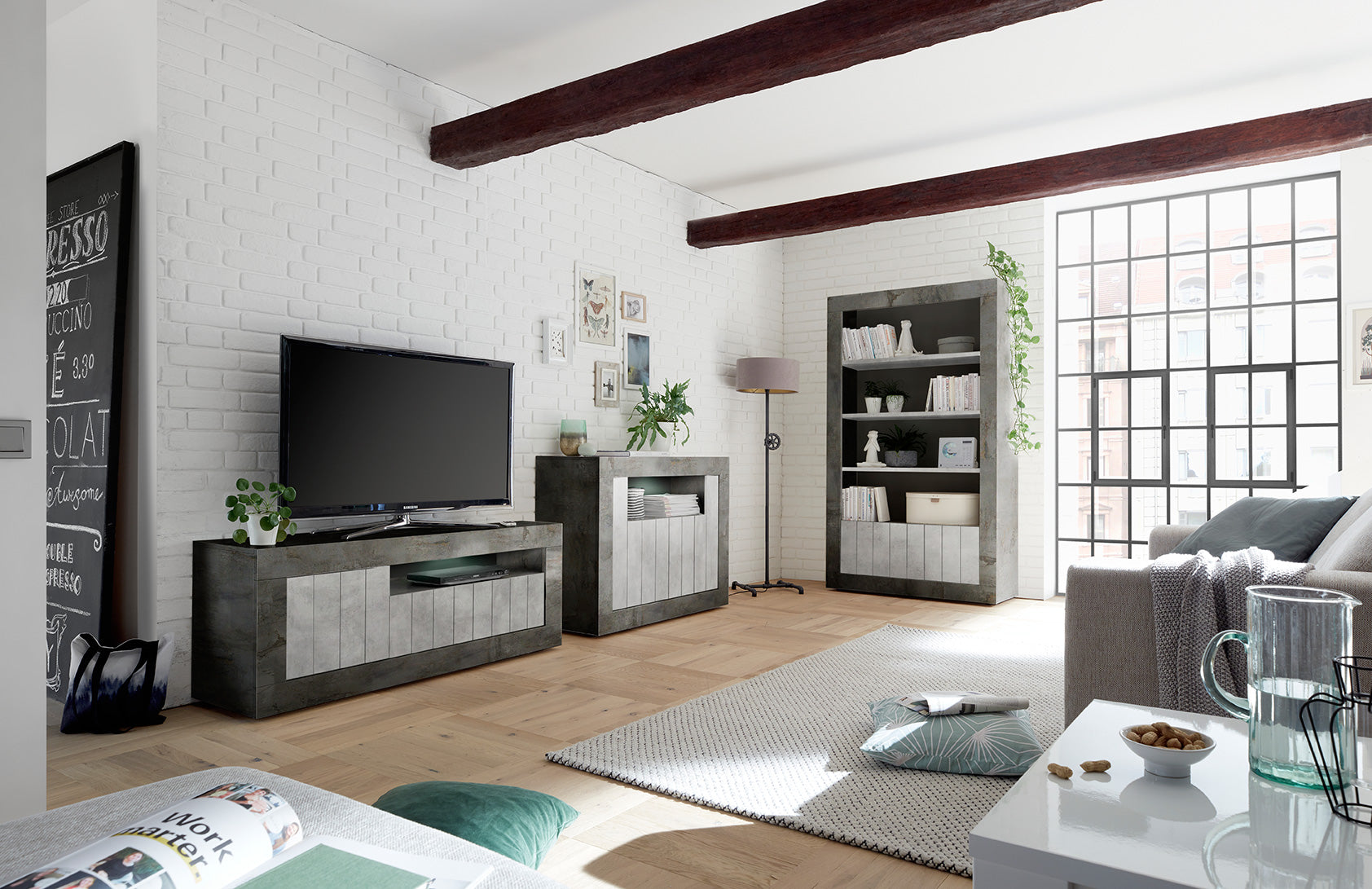 Eccezionale salotto completo con mobile tv, credenza 2 ante e ampia libreria Zurigo, reso particolare per i colori che realizzano la struttura e i frontali, ovvero cemento e ossido. Dotato di elementi funzionali e pratici oltre che robusti, Zurigo è una soluzione già pronta per arredare il salotto con uno stile davvero originale.